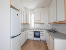 Keittiö on suunniteltu käytännölliseksi ja tarjoaa hyvin säilytystilaa. Kaappeihin mahtuvat vaivatta myös isommat kulhot, kattilat ja muut ruoanlaittovälineet. Keittiön lisäksi kaappi- ja säilytystilaa löytyy kummastakin makuuhuoneesta sekä eteisestä, mikä helpottaa arjen järjestystä. Arjen sujuvuutta lisäävät erillinen wc sekä oma sauna, jotka tuovat asumiseen mukavuutta.