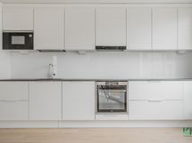 - Puustellin valkoinen avokeittiö, jossa kvartsitasot, välitilalasi, Damixan keittiöhana kromi, Lapetekin musta komposiittiallas, AEG:n kalustepeitteiset kodinkoneet: jääkaappipakastin, astianpesukone, induktioliesitaso, liesikupu, erillisuuni, mikroaaltouuni