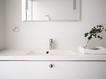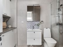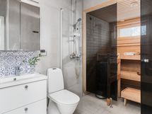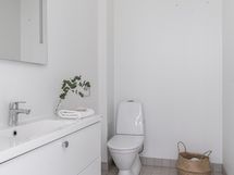 Pesutilojen varusteet: WC-istuin, kylpyamme, suihkuseinä, allaskaappi, peilikaappi, bidee-suihku, lattialämmitys ja pesukoneliitäntä. Erillisten WC:n lukumäärä: 1. Erillisen WC:n varusteet: WC-istuin, allaskaappi, peili ja pesuallas.