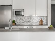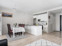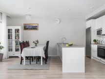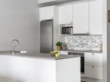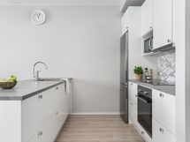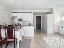 Keittiön varusteet: Jääkaappipakastin, liesituuletin, astianpesukone ja liesi. Liesi: Keraaminen liesi ja induktioliesi. Työtason materiaali: Laminaatti.
