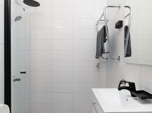 - WC-istuin, musta suihku, musta suihkuseinä, pesukoneliitäntä, peili, pesuallas, allaskaappi ja bidee-suihku