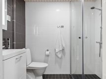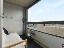 Kylpyhuone on yhtä lailla tilava ja pinnoiltaan moitteeton. Kokonaisuuden kruunaa oma parveke, jonka lasituksen suojissa viihdyt säällä, kuin säällä.
