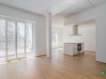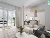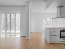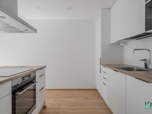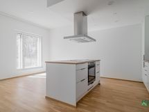 - Kalustepeitteiset jääkaappipakastin ja astianpesukone, integroitu mikroaaltouuni, kiinteä saareke jossa induktioliesitaso, kalusteuuni ja liesikupu, hana elektronisella pesukoneventtiilillä, rosteliallas sekä kiinteät led-valaisimet
