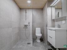 - Suihku, kääntyvä suihkuseinä, wc-istuin, allas, peilikaappi valolla, allaslaatikosto, käsisuihku, hana, pesukoneliitäntä, pyykkikaappi
