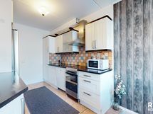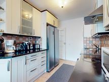 liesituuletin, jääkaappi/pakastinkaappi 2024, lattia laminaattia / laattaa, seinät tapettia.