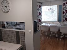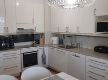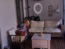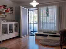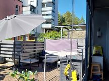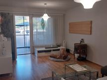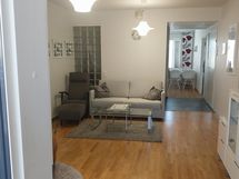 Valoisa ja tilava olohuone avautuu lasitetulle parvekkeelle, jossa voit nauttia aamukahvisi rauhassa.