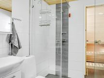 - Kylpyhuone, suihku, pesukoneliitäntä, peilikaappi, lattialämmitys, kylpyhuonekaapisto, sauna, suihkuseinä, allaskaappi