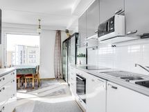 - jääkaappi/pakastin, keraaminen liesi, uuni, liesituuletin, astianpesukone, kaapistot