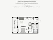 Tässä viihtyisässä kaksiossa on avoin keittotila, joka avautuu olohuoneeseen. Keittiön materiaalit ovat Puustellin, eteisen säilytyskaapit toimivaa Elfaa. Makuuhuoneen yhteydessä on oma vaatehuone. Kylpyhuoneen yhteydessä on oma sauna, joka lämpenee vaikka joka päivä. Suurella lasitetulla parvekkeella on ihana vilvoitella löylyjen jälkeen. Parvekkeelle käydään kokolasisesta liukuovesta ja se avautuu länteen, puiston suuntaan.