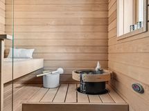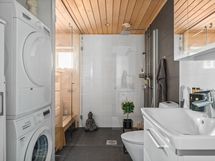 - Sauna, sähkökiuas, kylpyhuone, suihku sadesuihku, suihkuseinä lasinen, peilikaappi, kaapit 1 kpl, allaskaappi, pesukoneliitäntä, lattialämmitys, kiinteät valaisimet.