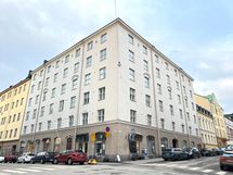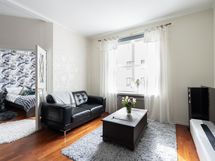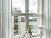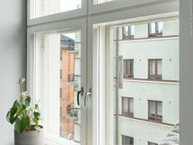 - Ikkunoita länteen, olohuone ja makuuhuone ilta-aurinkoon. Näkymä Mariankadulle päin.