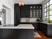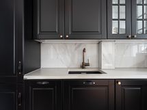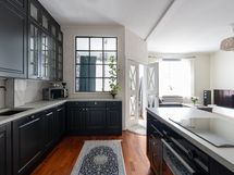 - Paljon kaappitilaa, Paljon työskentelytilaa, Lasikaapit, Suuri tiskipöytä, Betonitasot, Astianpesukone, Integroidut koneet, Induktioliesi, Jää-pakastinkaappi
