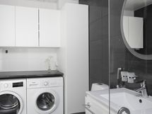 - Pesutilojen kuvaus: Kylpyhuoneessa on suihku, lattialämmitys, käännettävä suihkuseinä, allaskaappi, wc-istuin, valopeili, kaapistot ja pesukoneliitäntä.