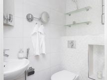 Lattiat on laattaa ja seinät on kaakeloitu. . Erillisen WC:n kuvaus: Erillisessä wc:ssä on lattialämmitys, peilikaappi, allas, seinä-wc, lasihyllyt, pyyhepatteri ja pyöreä peili.