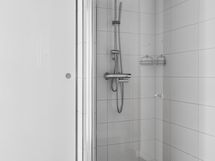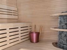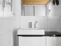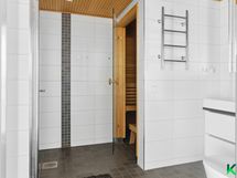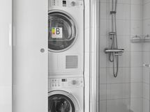 - Kylpyhuone, suihku, suihkuseinä, seinäkiinnitteinen wc-istuin, allas ja allaslaatikosto, käsisuihku, pyyhekuivain, liukuovikaapisto, jonka sisällä pyykinpesukone ja kuivausrumpu, sauna