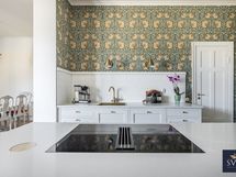 - Jääkaappi, pakastin, induktioliesi jossa integroituna liesituuletin, erillisuuni, astianpesukone, aamiaiskaappi (keskimmäinen pitkän seinän kaapeista).