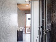 Yhdessä kylpyhuoneessa myös toinen poreamme sekä suihku. Varustus: kylpyamme, poreamme, suihkukaappi, lattialämmitys, wc-istuin, suihku, peilikaappi, peili. Erillisen WC:n kuvaus: Kylpyhuoneita 4 kpl joista kahdessa myös wc, lisäksi 3 erillis-wc. Varustus: poreamme, lattialämmitys, lattiakaivo, suihku, peilikaappi, bidee-suihku.