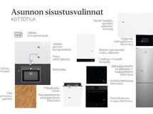 Keittotilan kalusteet Puustellin valikoimista. Yläkaapin ovet ovat vetimettömiä ja alakaapeissa metallivedin. Työtaso laminaattia, hana on vettä säästävä ja allas komposiittia. Välitilassa on alumiinikomposiittilevy. Uuni ja mikro ovat mustia ja kylmälaite teräksen värinen. Lisäksi induktiokeittotaso ja kalustepeitteinen astianpesukone.