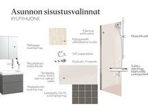 Kylpyhuoneessa on eläväpintaiset laatat. Seinälaatan koko on 30x60 cm, asennus vaakaan. Katossa on valkolakattu kuusipaneeli ja kattoon upotetut led-valaisimet. Peili- ja allaskalusteet ovat samaa sävyä.