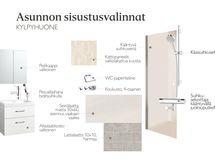 Kylpyhuoneessa on eläväpintaiset laatat. Seinälaatan koko on 30x60 cm, asennus vaakaan. Katossa on valkolakattu kuusipaneeli ja kattoon upotetut led-valaisimet. Peili- ja allaskalusteet ovat samaa sävyä.
