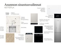 Keittotilan kalusteet Puustellin valikoimista. Yläkaapin ovet ovat vetimettömiä ja alakaapeissa lippavetimet. Sivu- ja täytelevyt ovien sävyiset. Työtaso laminaattia, hana on vettä säästävä ja allas ruostumatonta terästä. Välitilassa on alumiinikomposiittilevy. Uuni ja mikro ovat mustia ja kylmälaite teräksen värinen. Lisäksi induktiokeittotaso ja kalustepeitteinen astianpesukone.
