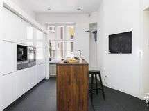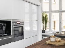 - Liesi: kaasu, keraaminen. Työtasot: puu. Kylmäsäilytys: jääkaappi/pakastin. Varustus: astianpesukone. AEG:n höyrykiertoilmauuni ja jääkaappi, kaasu- ja keraaminen liesi, Siemensin astianpesukone. Laattalattia, puinen saareke.