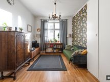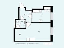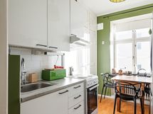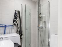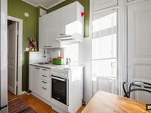 Keittiö on oma tilansa, josta löydät toimivien ruoanlaittopuitteiden lisäksi paikan myös ruokailulle. Olohuoneen avaruus mahdollistaa monenlaiset sisustusjärjestelyt, erityisesti kätevän alkovin ansiosta. Kylpyhuone on pinnoiltaan siisti, tyylikkään moderni sekä tarpeeksi tilava myös pesukoneelle.