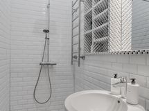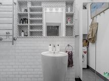 - Kylpyhuoneessa suihku, pyyhekuivain, peili, pesuallas, pesukoneliitäntä, kylpyhuonekaapistot. Erillis wc:ssä peili, pesuallas, lattialämmitys