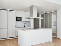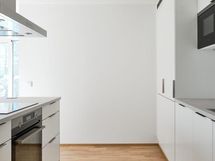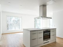 - Kalustepeitteiset jääkaappi, pakastin ja astianpesukone, integroitu mikroaaltouuni, hana elektronisella pesukoneventtiilillä, rosteliallas, kiinteät led-valaisimet ja kiinteä saareke, jossa induktioliesitaso, kalusteuuni ja liesikupu