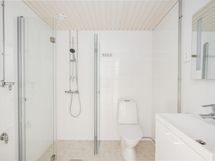 Pesutilojen kuvaus: Suihkuseinät molemminpuolin sulkeutuvat yhteen. Varustus: suihkuseinä, pesukoneliitäntä, lattialämmitys, wc-istuin, suihku, peili, kiinteät valaisimet.