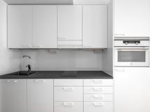 Liesi: induktio, erillisuuni. Työtasot: laminaatti. Kylmäsäilytys: jenkkikaappi. Varustus: liesituuletin, mikroaaltouuni, astianpesukone, kiinteät valaisimet. Kodinkoneet integroidut