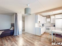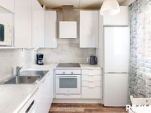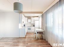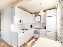 - Keittiön varusteet: Jääkaappipakastin, jääkaappi, astianpesukone, uuni, liesituuletin ja liesi. Liesi: Induktioliesi. Työtason materiaali: Laminaatti.