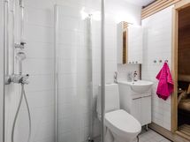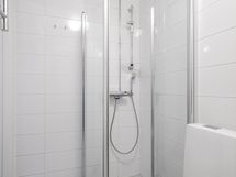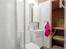 - Suihkuseinä, Pesukone, Pesukonevalmius, Peilikaappi, Allaskaappi, Rättipatteri, Laattalattia, Lattialämmitys
