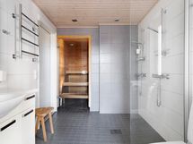 - Sauna, kph: 2 suihkua, suihkuseinä, wc-istuin Gustavsberg, 2 pesuallasta, pesuallashana bideellä, 2 peiliä valopeiliä Mido, kylpyhuonekaapisto . Erillinen wc: valopeilikaappi, wc-istuin Gustavsberg, pesuallas, pesuallashana bideellä.