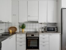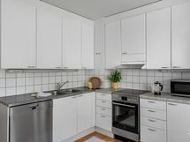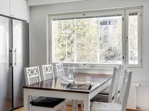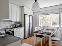 - Tilava keittiö jossa maalatut mattavalkoiset kaapistot, laminaattitasot, täyskorkeat jääkaappi ja pakastin uusittu 06/2021. Astianpesukone Miele 03/2021. Uuni ja liesi (induktio) 2022, välitila laatoitettu. Suurikin ruokaryhmä mahtuu. Lattiat kulutusta kestävää laminaattia.