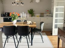 - Tilaa isolle ruokapöydälle, Paljon kaappitilaa, Paljon työskentelytilaa, Suuri tiskipöytä, Kivitasot, Astianpesukone, Integroidut koneet, Induktioliesi, Jää-pakastinkaappi