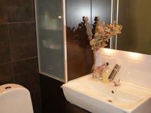 - Suihku, Suihkuseinä, Pesukonevalmius, Peilikaappi, Allaskaappi, Rättipatteri, Laattalattia, Laattaseinä, Lattialämmitys