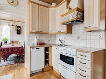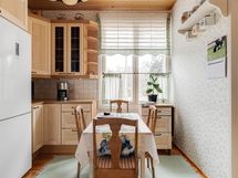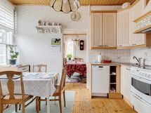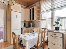 - Jääkaappi/pakastin, keraaminen liesi, liesituuletin hormiin, astianpesukone, kaapistot. Lattia: puu. Seinät: Maalattu