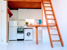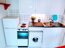 - Varusteet: jenkkikaappi. Liesi: sähköliesi. Pesukone