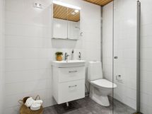 - Pesutilojen varusteet: WC-istuin, suihku, suihkuseinä (taittuva), lattialämmitys, peilikaappi, allaskaappi ja bidee-suihku.