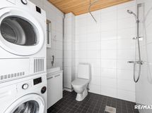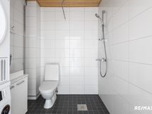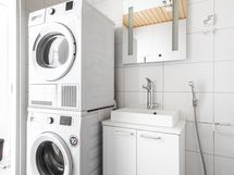 - Pesutilojen kuvaus: Laatoitetussa kylpyhuoneessa peili, allas ja allaskaappi, wc-istuin, suihku, lattialämmitys ja pyykkitorni (rakennuttajan hankkiman pesutornin huolto-, korjaus- ja uusimiskustannukset kuuluvat osakkaan vastuulle). Allaskaappi kaipaa päivitystä uuteen.
