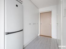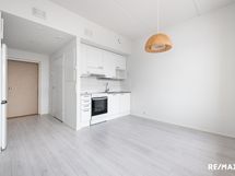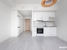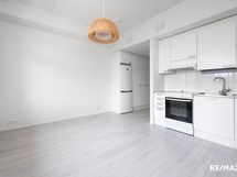 - Valkoisessa keittiössä keraaminen liesi/uuni, paikka mikroaaltouunille ja jääkaappipakastin. Välitila laatoitettu ja pöytä laminaattia.