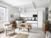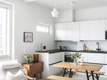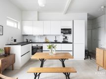 - Keittiössä on liesituuletin, mikroaaltouuni, jääkaappi/pakastin-yhdistelmä, astianpesukone, erillisuuni ja iduktioliestitaso. Keittiössä on integroidut kodinkoneet.