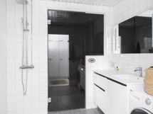- Pesutilojen kuvaus: Kylpyhuoneessa on lattialämmitys, peili, allaskaappi, pesukoneliitäntä, wc-istuin ja sadesuihku.