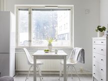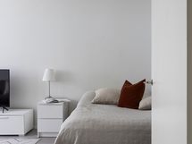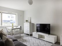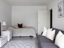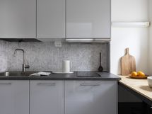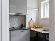 - Varustus: kaksitasoinen keraaminen liesi, liesituuletin (aktiivihiili), jääkaappi/pakastin, harmaat kaapistot.