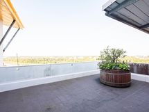 Yläkerta tarjoaa monikäyttöisen, avaran huoneen, joka toimii loistavasti joko makuuhuoneena, työtilana tai vaikka harrastehuoneena. Huoneesta on suora kulku asunnon sydämeen – suurelle terassille, joka avautuu kaupungin ylle ja tarjoaa upeat näkymät sekä tilaa oleskeluun, viljelyyn tai vaikka kesäjuhliin. Yläkerrasta löytyy myös toinen kylpyhuone, joka lisää asumismukavuutta ja tekee arjesta sujuvampaa.