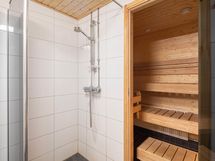 Ensimmäisessä kerroksessa avautuu kaksi tilavaa makuuhuonetta, joissa on runsaasti kaappitilaa. Avara olohuone suurine ikkunoineen ja korkean huonekorkeuden ansiosta tulvii luonnonvaloa ja kutsuu viihtymään. Keittiö on käytännöllinen riittävällä kaappi-ja laskutilalla, uudella keraamisella liedellä sekä kahdella jääpakastinkaapilla. Keittiön yhteydessä pieni parveke, jossa voi nauttia vaikka aamukahvista. Lisäksi ensimmäisessä kerroksessa on erillinen wc sekä kylpyhuone, jonka yhteydessä oma sauna – täydellinen paikka rentoutumiseen.