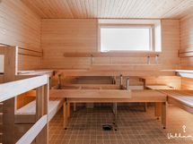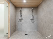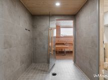 - Pesutilojen kuvaus: Laattalattia. Seinät kaakelia. Katto paneloitus (valkukuullotettua kuusta). Varustus: