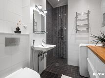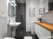 - Pesutilojen varusteet: WC-istuin (seinä), suihku, peili, peilikaappi, lattialämmitys, bidee-suihku, pesuallas ja laatikosto, rättipatteri.