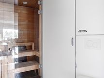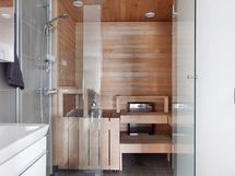 - Kylpyhuone: wc, suihku, suihkuseinä, käsisuihku, peilikaappi, allaskaappi, kylpyhuonekaapisto, kiinteät valaisimet, lattialämmitys. Sauna: sähkökiuas. Erillinen wc: wc, käsisuihku, peilikaappi, allaskaappi, lattialämmitys.